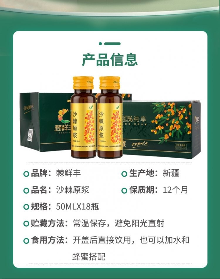 【集团定点】【新疆阿合奇】棘鲜丰沙棘原浆50ml*18瓶