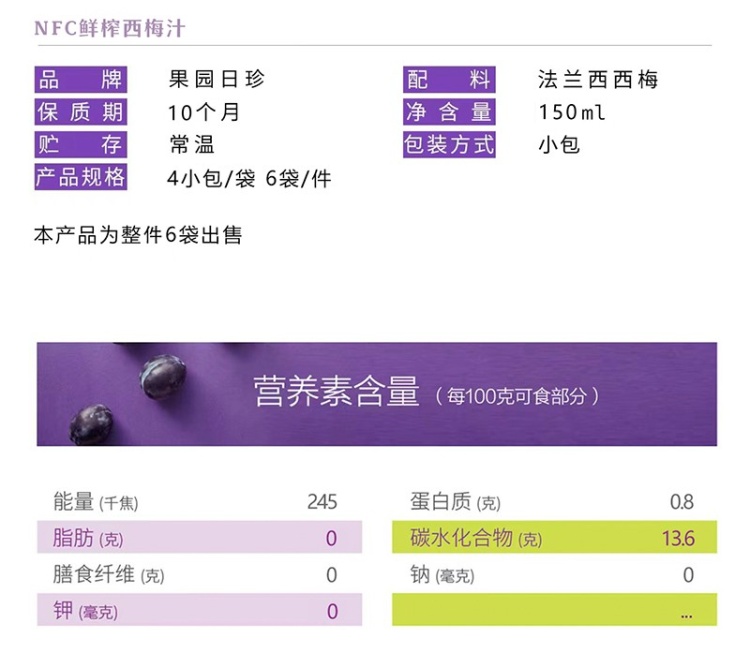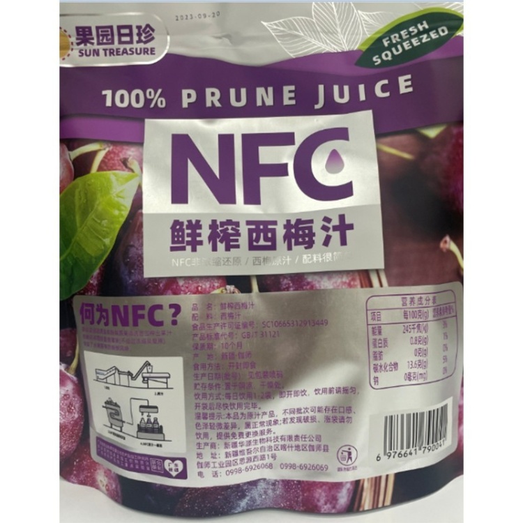 【中储粮集团新疆伽师县】新疆富伽NFC鲜榨西梅汁600ml/袋