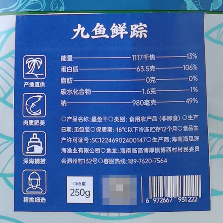 【海南临高县】九鱼鲜踪海鲜干货淡干墨鱼干250g