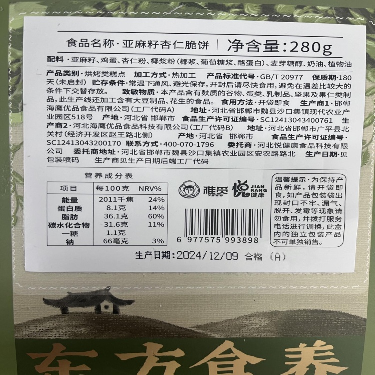 【河北魏县】雅觅亚麻籽杏仁脆饼280g饼干小吃