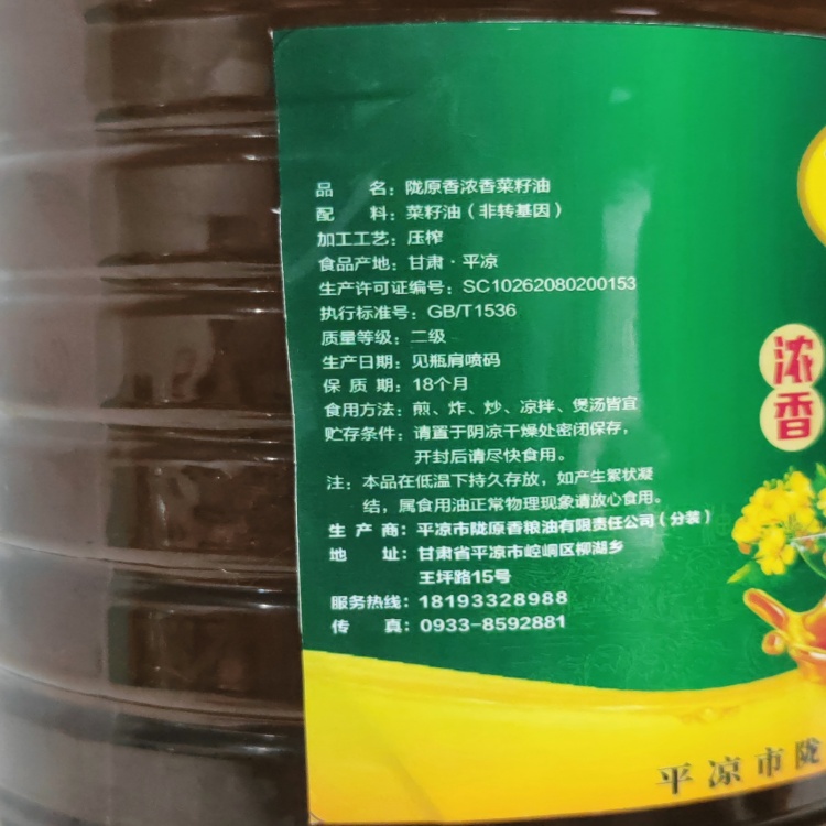 【甘肃崆峒区】陇原香浓香菜籽油5L/桶
