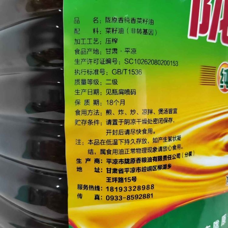 【甘肃崆峒区】陇原香非转基因纯香菜籽油20L/桶